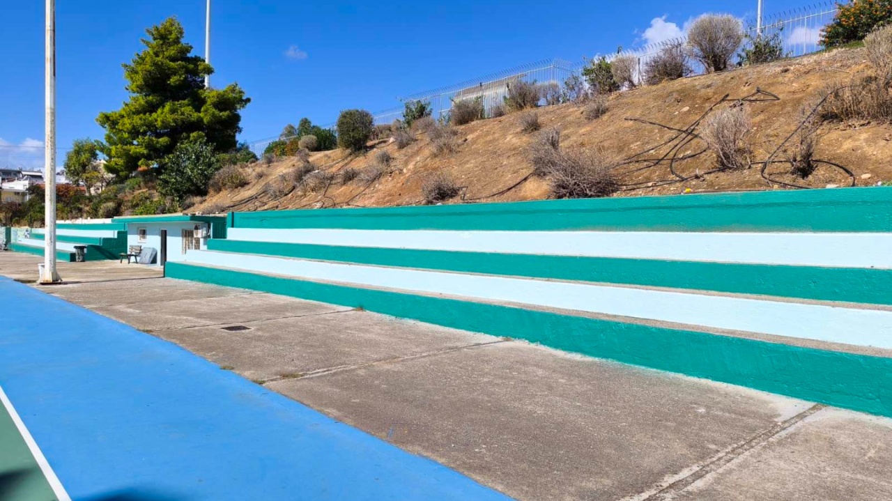 Συγκεκριμένα, προχώρησε σε αποκατάσταση επιχρισμάτων και χρωματισμούς διαφόρων επιφανειών στις κερκίδες στα γήπεδα του τένις και στο κλειστό γήπεδο.