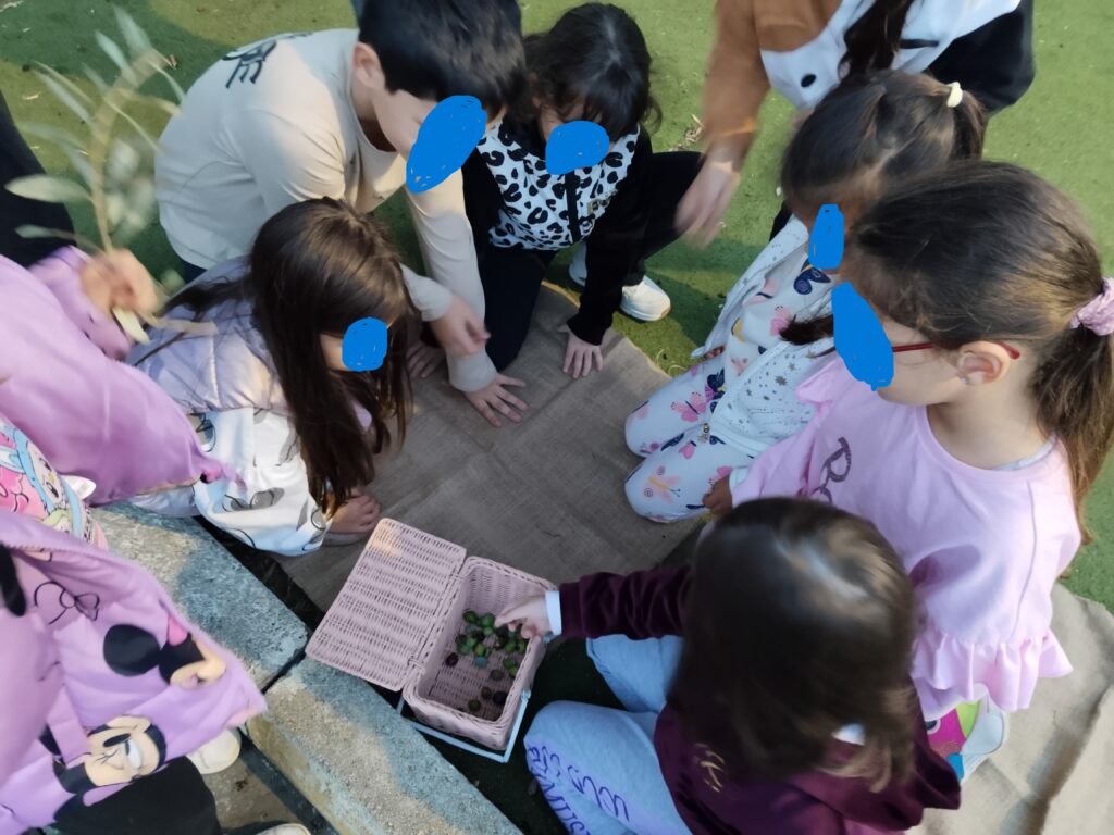 Τα παιδιά, με ενθουσιασμό, άπλωσαν τα πανάκια τους, χτύπησαν τα κλαδιά με τις μικρές τους βέργες και συνέλεξαν τον πολύτιμο καρπό της ελιάς, αναπαριστώντας το παραδοσιακό μάζεμα. Στη συνέχεια, μάζεψαν τις ελιές τους στο καλαθάκι, μπήκαν στην τάξη και παρατήρησαν πώς, ζουλώντας τον καρπό, παράγεται το λάδι.